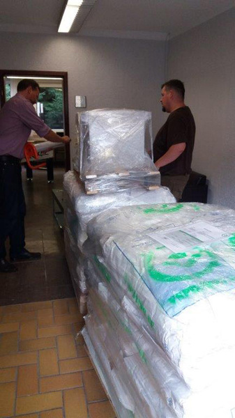 Unter anderem liefern wir Einzel- und Stockbetten, Matrazen, Bettdecken, Handtücher, Tische, einen Kühlschrank und Herd und vieles mehr, was Menschen für den Alltag brauchen.